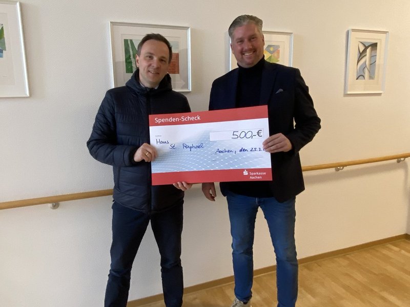 Der Leiter der Sparkasse in der Aachener Soers überreichte unserem Direktor Matthias Bonnie stellvertretend für das ganze Haus eine Spende